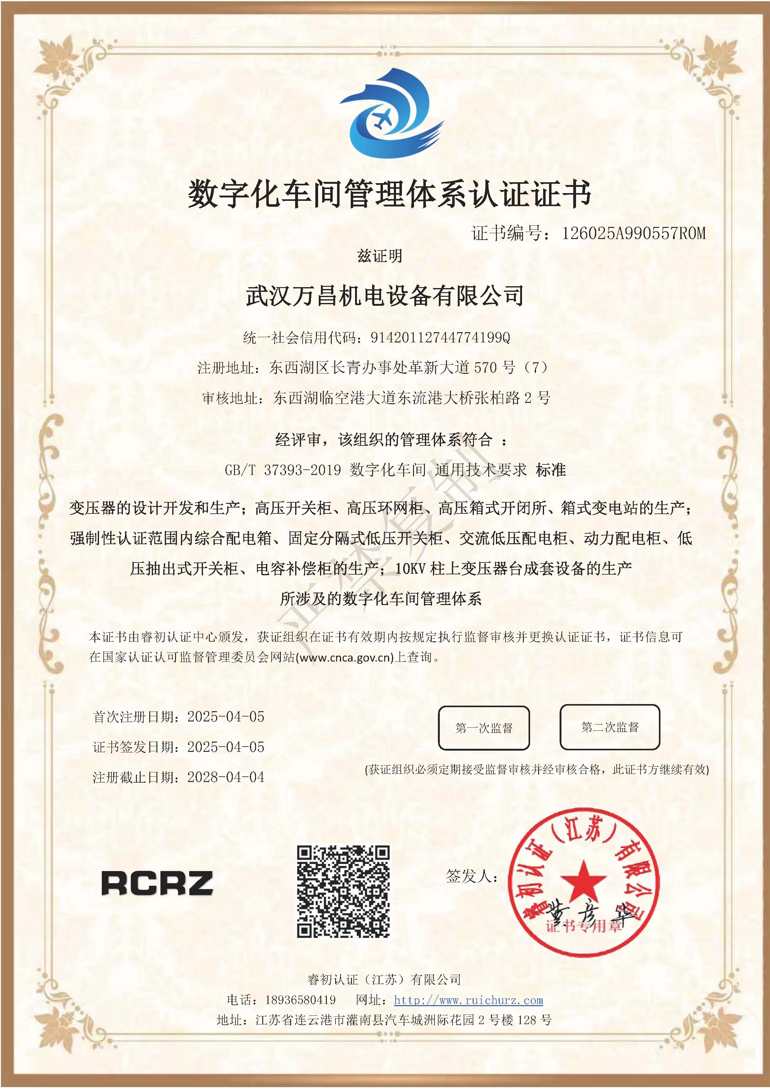 數(shù)字化車間管理體系認證證書